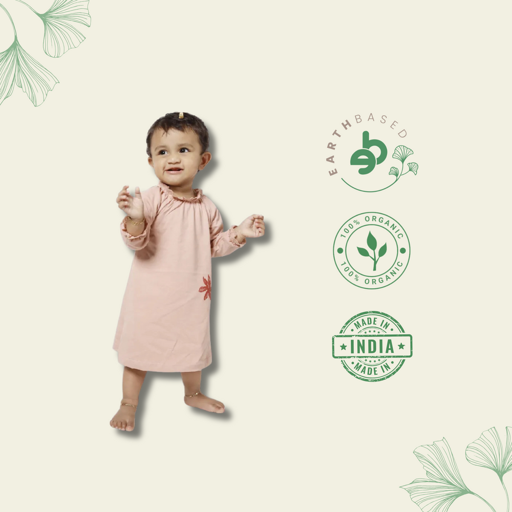 A line frock for girls of age 18 months to 5 years old with bishop sleevs, and a floral DTF sticker print. The frock comes in pair with balloon knicker. made with Organic cotton, 180 GSM, specially knitted by BABBLETYM, for babies comfort. BABBLETYM's own created TUSCANY organic coloring is given to the frock for enhancing the cutenes of the baby.