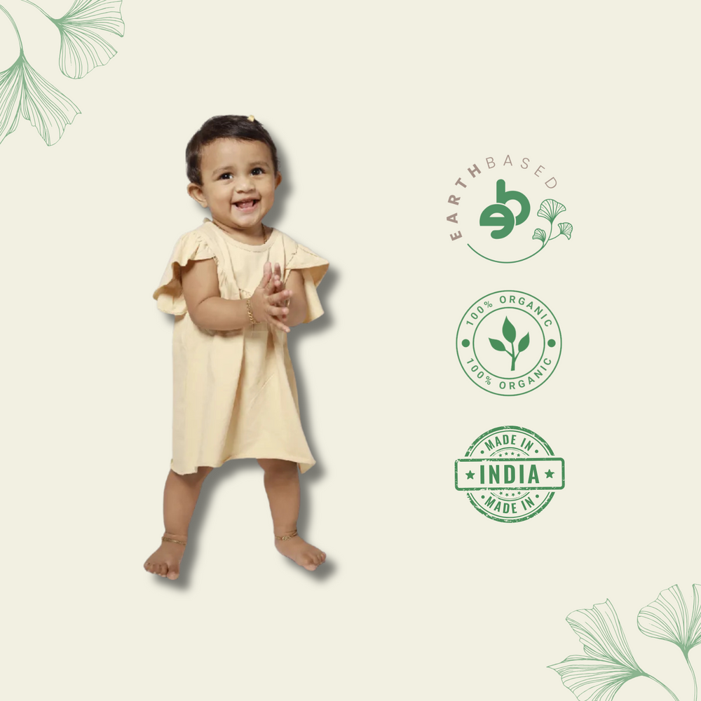 A line frock for girls of age 18 months to 5 years old with bishop sleevs, and a floral DTF sticker print. The frock comes in pair with balloon knicker. made with Organic cotton, 180 GSM, specially knitted by BABBLETYM, for babies comfort. BABBLETYM's own created TUSCANY organic coloring is given to the frock for enhancing the cutenes of the baby.
