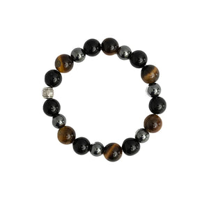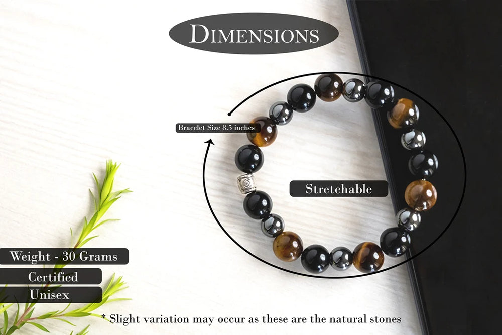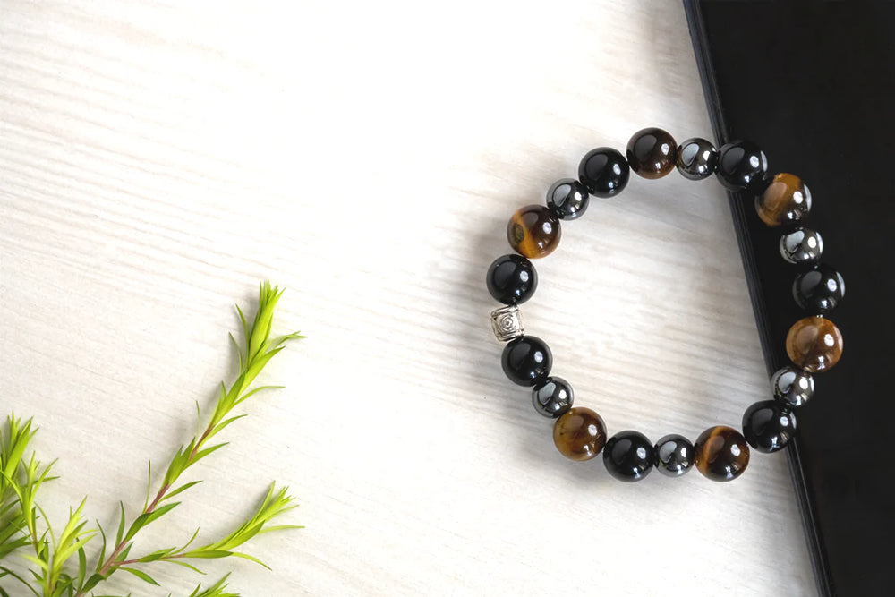 Natural Obsidian, Hematite, and Tiger Eye bracelet featuring metallic, shiny beads woven neatly with a strong elastic thread for a secure fit. The timeless design adds a classic touch that complements every personality. Each bracelet comes in an eco-friendly jute string pouch for safe storage and sustainability.