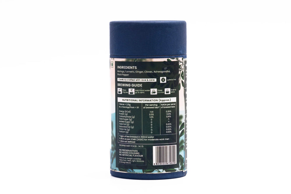 - Moringa, Green Tea, Hadjod, Gotu Kola, Dandelion, Chamomile, Arjuna Bark, Turmeric