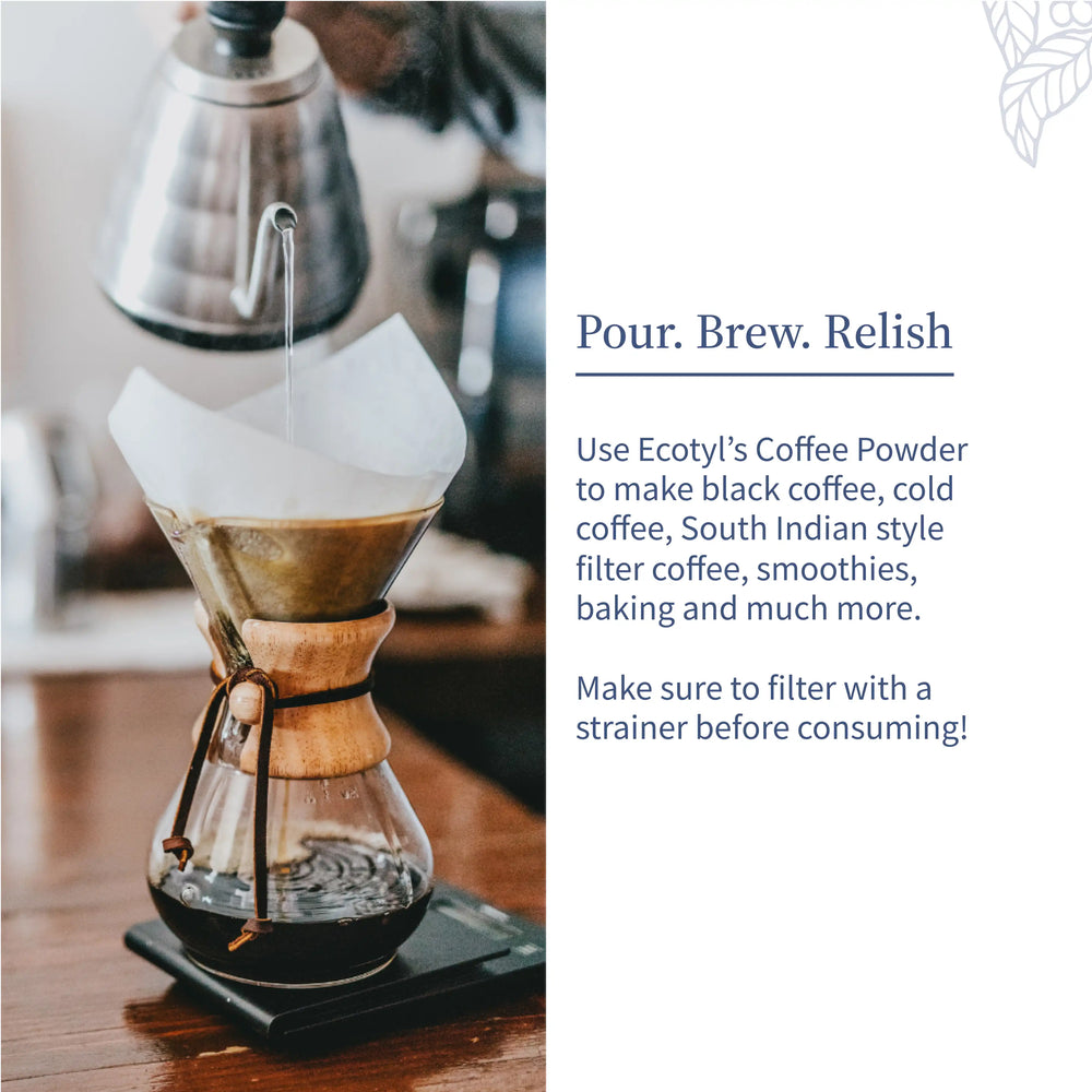 - Pour. Brew. Relish. Use Ecotyl's Coffee Powder to make black coffee, cold coffee, South Indian style filter coffee, smoothies, baking and much more.