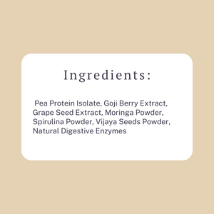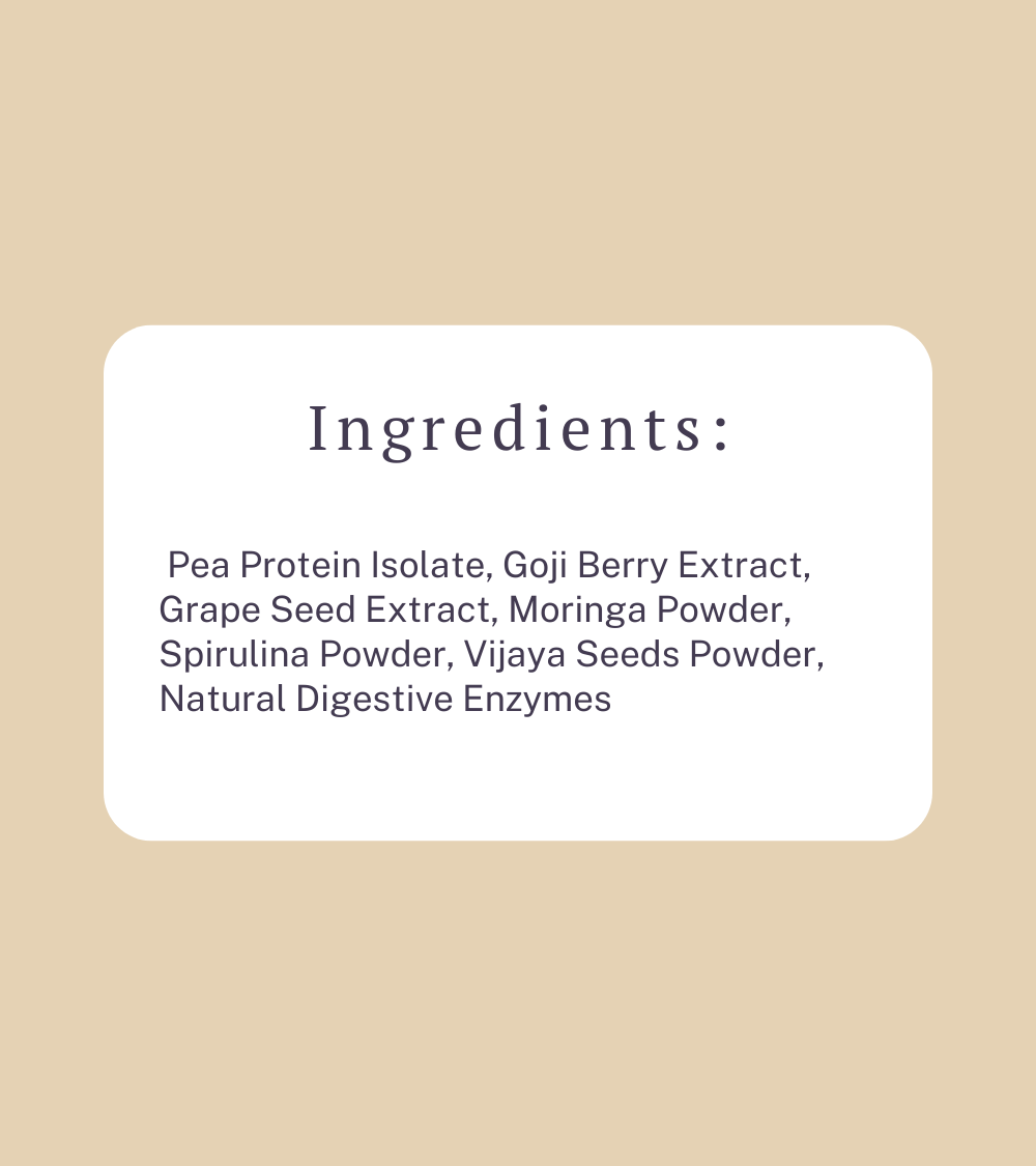 Pea Protein Isolate, Goji Berry Extract, Grape Seed Extract, Moringa Powder, Spirulina Powder, Vijaya Seeds Powder, Natural Digestive Enzymes