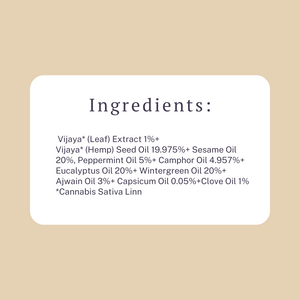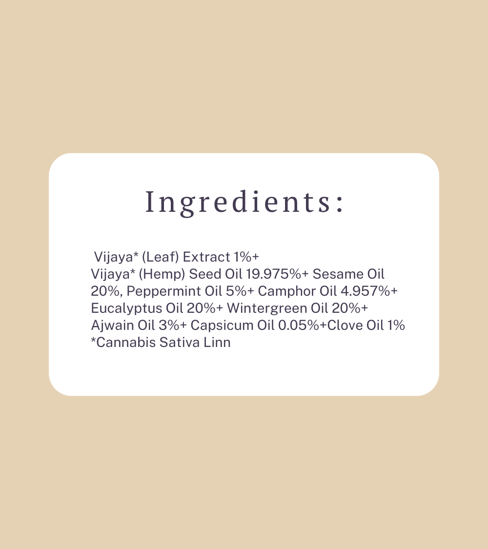 Vijaya (Leaf) Extract 1%+ Vijaya* (Hemp) Seed Oil 19.975%+ Sesame Oil 20%, Peppermint Oil 5%+ Camphor Oil 4.957%+ Eucalyptus Oil 20%+ Wintergreen Oil 20%+ Ajwain Oil 3%+ Capsicum Oil 0.05%+Clove Oil 1% *Cannabis Sativa Linn