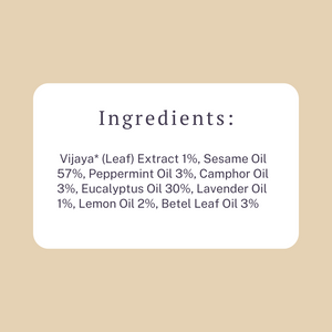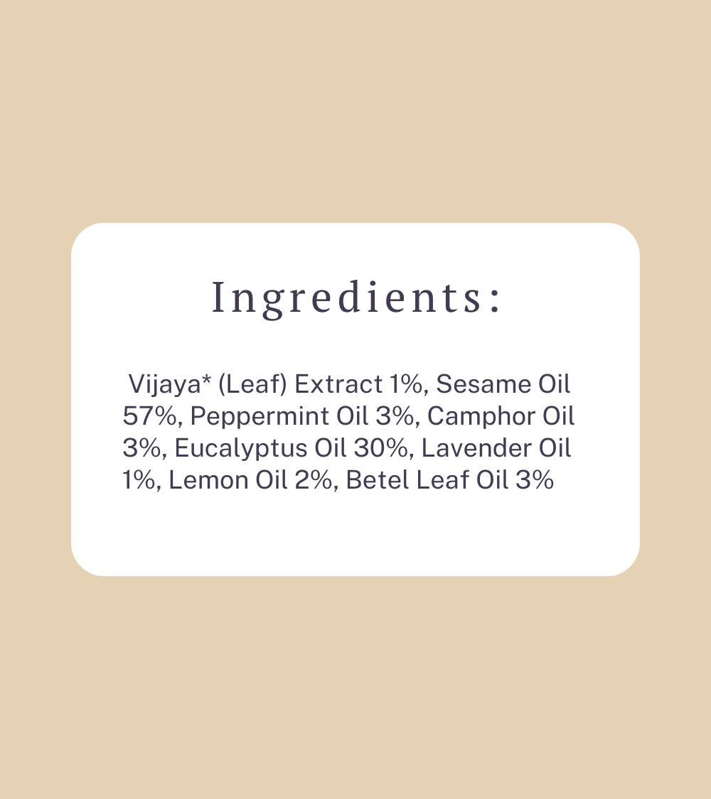 Vijaya* (Leaf) Extract 1%, Sesame Oil 57%, Peppermint Oil 3%, Camphor Oil 3%, Eucalyptus Oil 30%, Lavender Oil 1%, Lemon Oil 2%, Betel Leaf Oil 3%