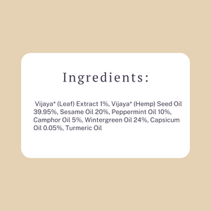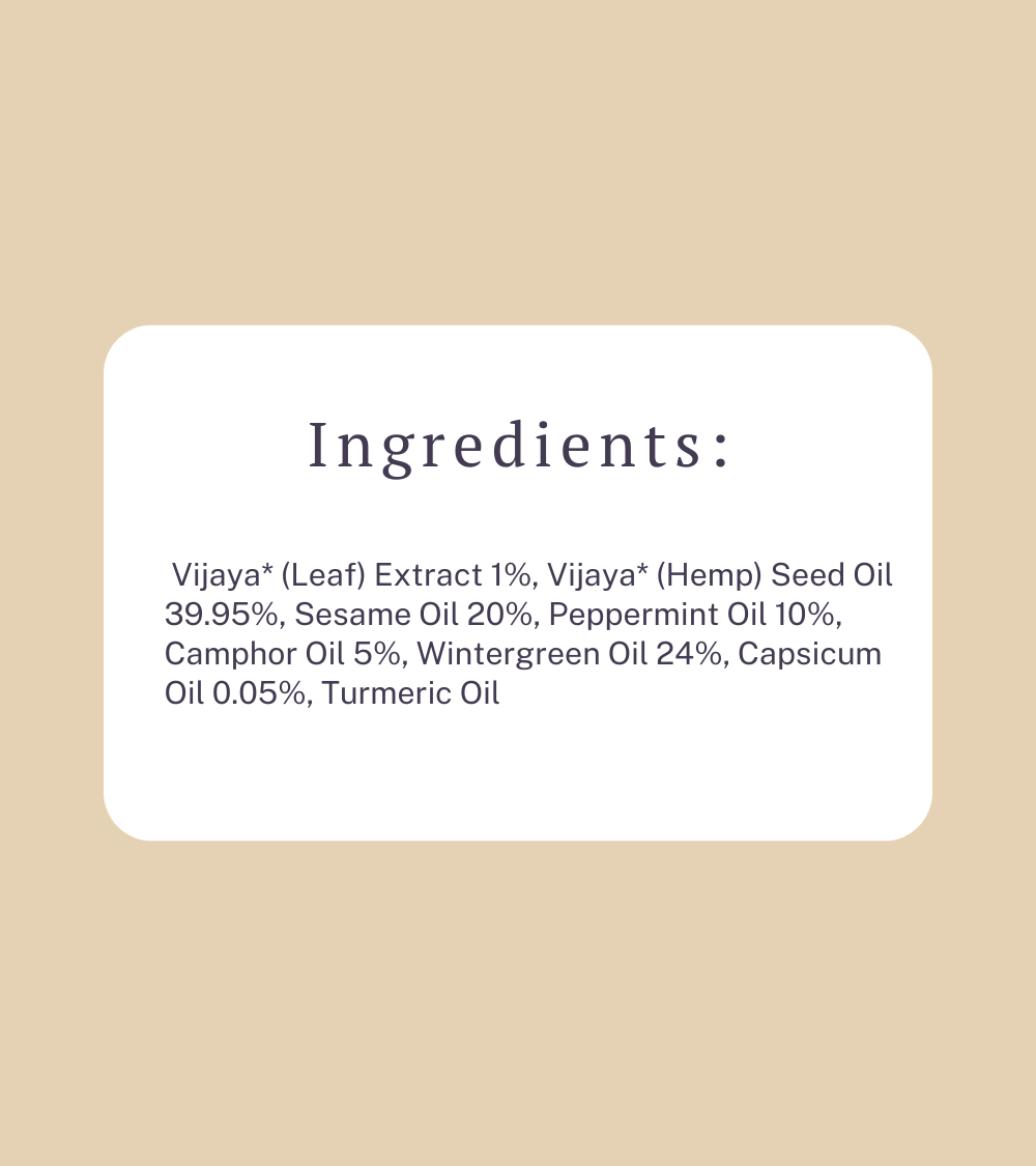 Vijaya (Leaf) Extract 1%, Vijaya* (Hemp) Seed Oil 39.95%, Sesame Oil 20%, Peppermint Oil 10%, Camphor Oil 5%, Wintergreen Oil 24%, Capsicum Oil 0.05%, Turmeric Oil