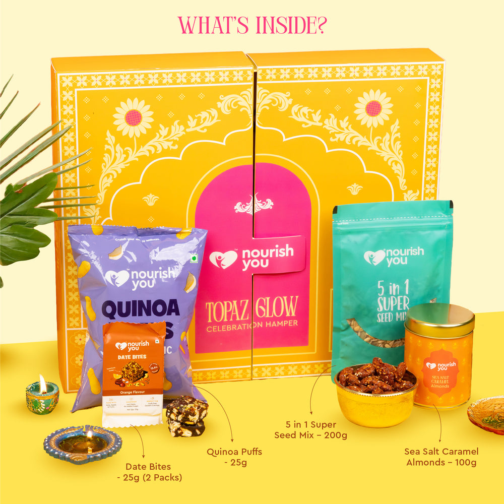 Nourish You Topaz Glow Celebration Diwali Dry fruits gift Hamper | 5-in-1 Super Seed Mix (200g) | 2 Dates Bites-25g each | Quinoa Puff (25g)|Sea Salt Caramel Almonds (100g)| Perfect for Diwali Gifting,Special Occasions