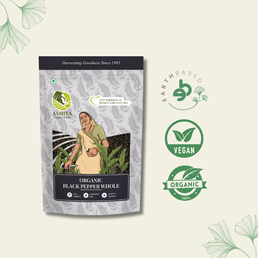 Introducing our extraordinary Organic Black Pepper, known as Kali Mirch, straight from the lush fields of Asmita Organic Farms in Vidarbha. Grown with utmost care and dedication, this exquisite spice carries flavour and health benefits within its tiny grains. Simply put, our gluten-free black pepper whole is nurtured in harmony with the environment, free from synthetic pesticides and chemicals.