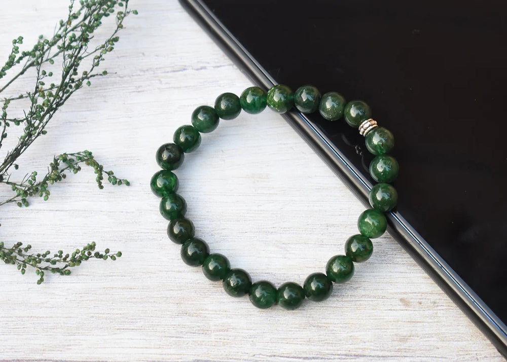 Original, certified Jade bracelet with 24 beads. Attractive glossy beads, neatly woven, with strong elasticated thread for good grip. These calming Green beads has luxurious look which would definitely enhance your personality. This bracelet comes in an attractive Velvet string pouch which makes easy to keep it safe.