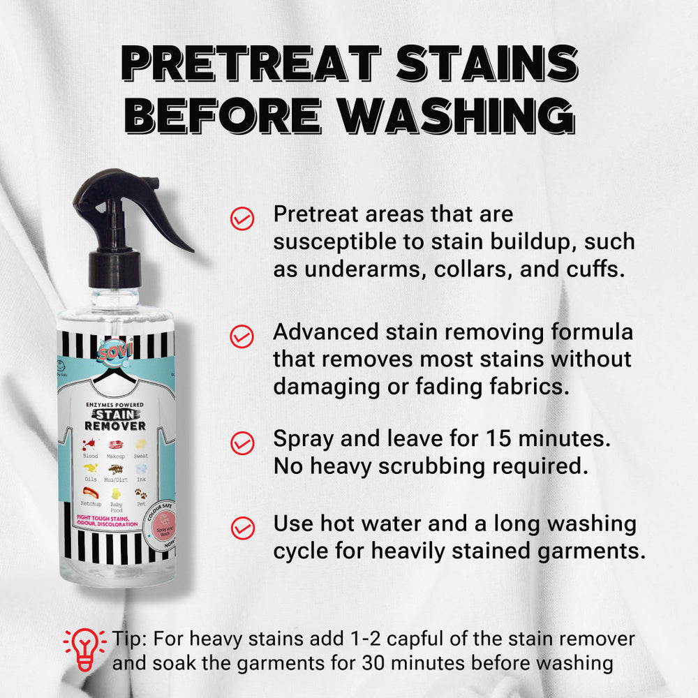 Simply put a cap or 2 of SOVI® Stain Remover to your laundry load and run a washing cycle for stain and odour free garments."
