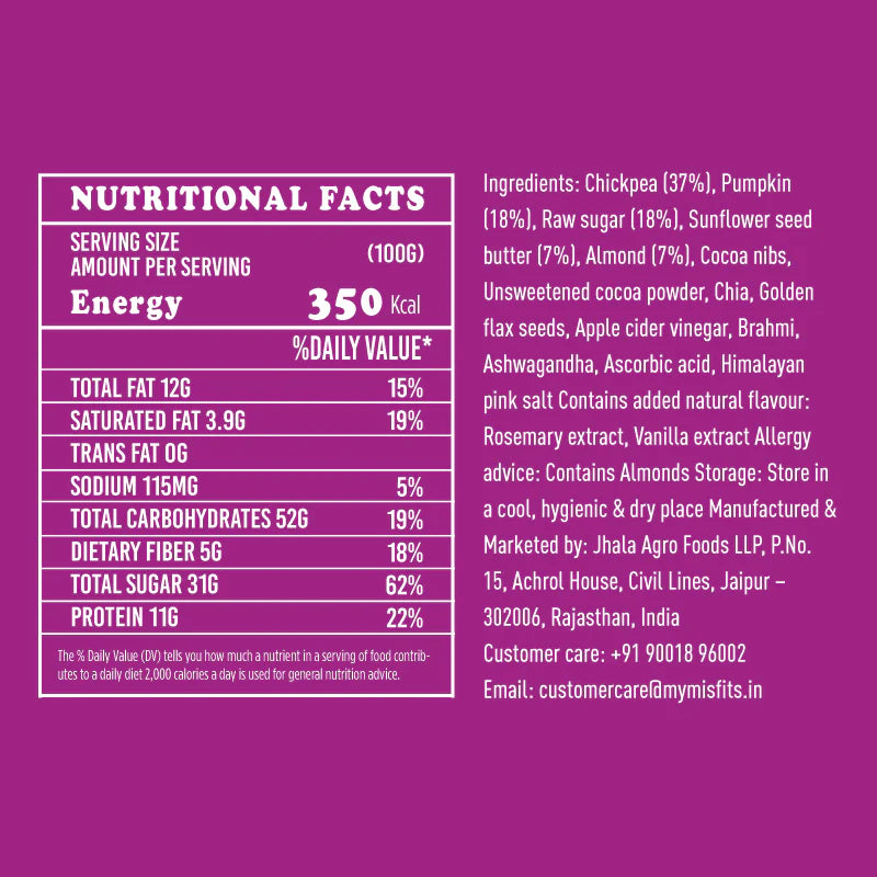 - Chickpea (37%), Pumpkin (18%), Raw sugar (18%), Sunflower seed butter (7%), Almond (7%), Cocoa nibs, Unsweetened cocoa powder, Chia, Golden flax seeds, Apple cider vinegar, Brahmi, Ashwagandha, Ascorbic acid, Himalayan pink salt