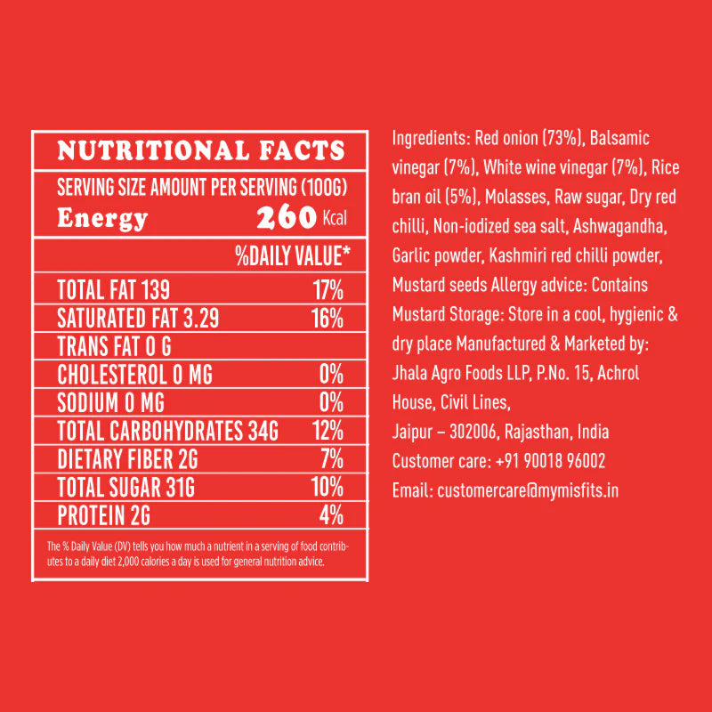- Red onion (73%), Balsamic vinegar (7%), White wine vinegar (7%), Rice bran oil (5%), Molasses, Raw sugar, Dry red chilli, Non-iodized sea salt, Ashwagandha, Garlic powder, Kashmiri red chilli powder, Mustard seeds.
