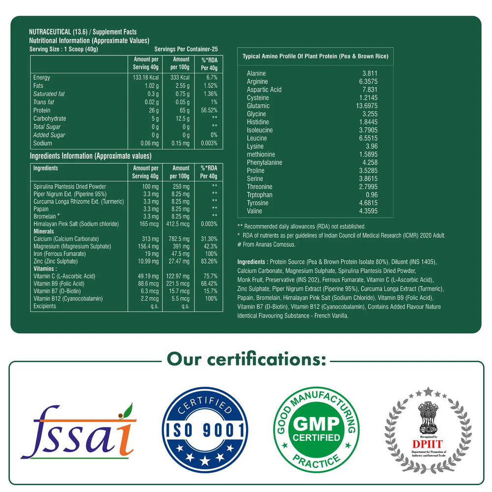 Protein Source (Pea & Brown Protein Isolate 80%), Diluent (INS 1405), Calcium Carbonate, Magnesium Sulphate, Spirulina Plantesis Dried Powder, Monk Fruit, Preservative (INS 202), Ferrous Fumarate, Vitamin C (L-Ascorbic Acid), Zinc Sulphate, Piper Nigrum Extract (Piperine 95%), Curcuma Longa Extract (Turmeric). Papain, Bromelain, Himalayan Pink Salt (Sodium Chloride), Vitamin B9 (Folic Acid), Vitamin B7 (D-Biotin), Vitamin B12 (Cyanocobalamin), Contains Added Flavour Nature Identical Flavouring Substance - French Vanilla.
