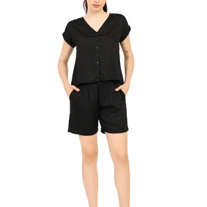 Women’s Modal Satin Night Suit – 2PC Soft Shirt & Shorts Sleepwear | Black