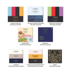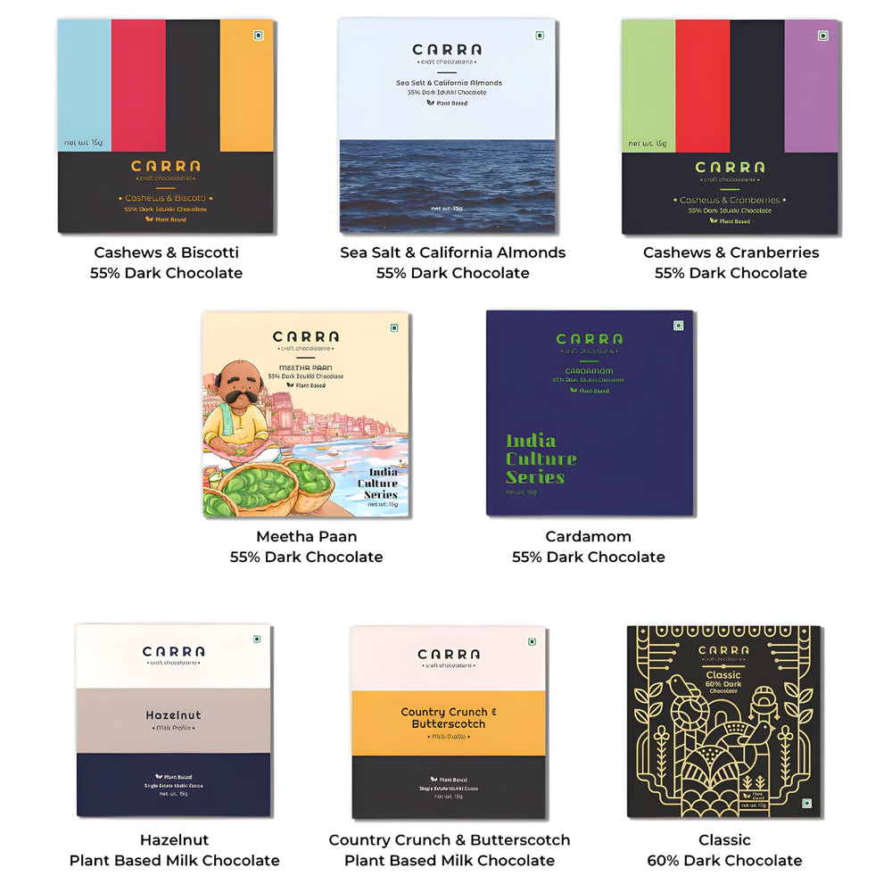 Assorted 8-Pack by CARRA” includes eight distinct flavours as described above: Classic 60% Dark, Country Crunch & Butterscotch (Plant Based), Rock Salt & Roasted Almonds Sugar Free, Meetha Paan 55% Dark, Cardamom 55% Dark Mini, Lemon & Cranberries Vegan White, Orange 70% Dark, Hazelnut Plant Based Milk.