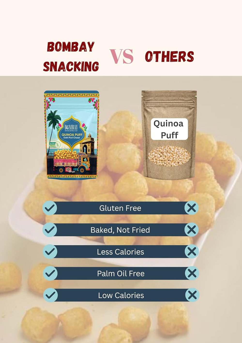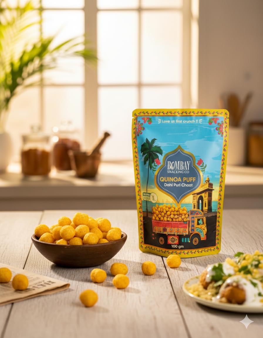 Bombay Snacking Co. Roasted Quinoa Puffs – Dahi Puri Chaat Flavour, Gluten-Free, Artisanal Roasted Healthy Snack | 2 x 100g | High Protein