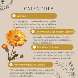 - Healing and Soothing: Calendula is renowned for its anti-inflammatory and healing properties. It soothes irritated or inflamed skin and promotes faster healing of minor cuts, rashes, or skin irritations. Combined with the moisturizing benefits of cocoa and mango butters, this soap bar is especially effective for calming and healing sensitive or damaged skin.