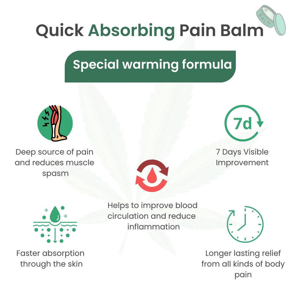 Naturally enriched with the goodness of Hemp Seed Oil infused with other medicinal oils makes balm a quick-acting on headache and body ache reliever that remedies pain naturally. Indications: Body Pain, Muscle Pain, Headache, Joint Pain. Get quick & long lasting pain relief with Cannarma Hemp Pain Relief Balm.Suitable for Muscle Pain, Back Pain, Joint Pain, Knee Pain, Ankle Pain, Sprains, Spasms & Cramps. 100% Ayurvedic formula – Contains Hemp Seed Oil, Flax oil, Till oil, Cinnamon Oil, Ajwain Oil, Lemongrass oil, Coconut oil, Natural Beewax, Peppermint Oil. Useful for injuries or pain due to Sports activities, Fitness or Gym Workouts & Daily household activities. Small convenient packaging makes it easy to carry everywhere you go. Effective Pain Relief: Our Hemp Natural Pain Relief Balm is expertly crafted to alleviate discomfort in the knees, back, neck, and shoulders, providing targeted relief for pain and stiffness.