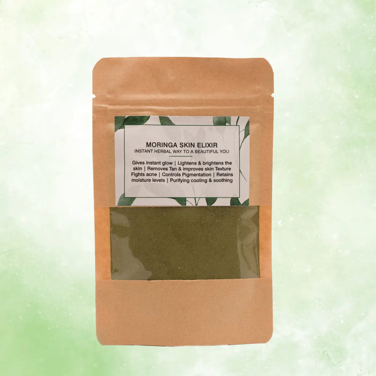 Moringa Skin Elixir is made from healthy ingredients like Moringa leaves, Orange Peel, Red Sandalwood, Organic Turmeric, Rose petals powder, Neem powder, Tea Tree Essential Oil, and Moringa Oil. This potent face elixir is chemical and preservative-free. It is helpful in skin conditions such as acne and pigmentation. It will help you get rid of tan and make your skin lighter and give you a brighter complexion. The face pack is uniquely formulated to hydrate, cool, and protect one's face. It also has antifungal, antiseptic, and antibacterial properties. It can also be used as a daily face wash as a substitute for harmful face wash liquids.