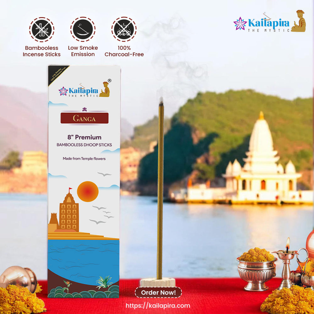 The Ganga incense sticks are hand-rolled using flower powders and fresh herbs. It promotes well-being and relaxation. These Dhoop sticks are 1005 natural air purifiers. These leave a delicate scent and help in promoting a tranquil environment. To enhance burning, these sticks do not contain chemicals, synthetic fragrances, or carbon.