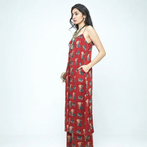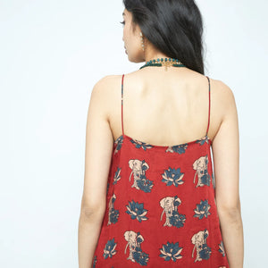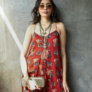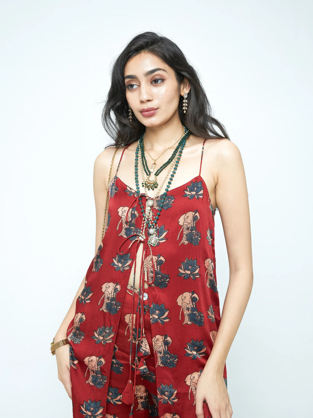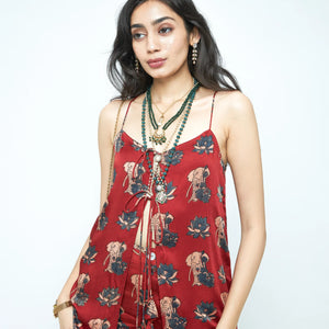 Description: A plunge-neck tunic in modal featuring the Gentle Giant print. Designed with slim straps, front tie-ups, and a fluid fit, it balances ease and elegance — perfect for layering or wearing as a statement piece on its own.