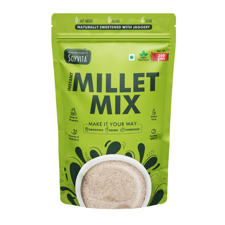 SoyVita Instant Millet Mix brings you the perfect balance of traditional nutrition and modern convenience. Made with a wholesome blend of ancient millets and naturally sweetened with pure jaggery, this mix is crafted to deliver clean energy, rich nutrition and satisfying taste in every serving. Whether you're rushing through your morning or need a quick, nourishing snack, this millet mix fits seamlessly into your healthy lifestyle.
