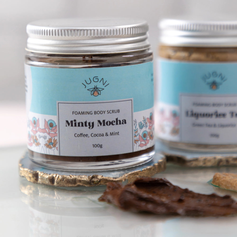 Jugni’s Minty Mocha Body Scrub is the perfect blend of invigorating mint, rich cacao, and coffee to indulge and revitalise your skin, bringing a spa-like experience right into your home. This luxurious scrub combines the refreshing essence of peppermint with the indulgent warmth of mocha, creating an energising ritual that awakens the senses while deeply caring for your skin.