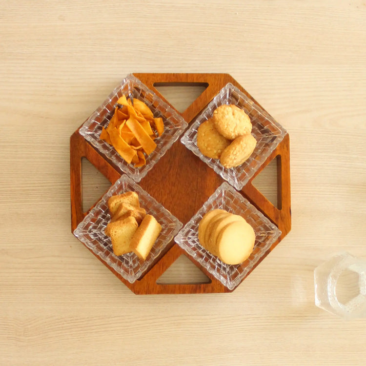 This Octagonal 2.0 wooden platter and tray is a perfect partner for all your high teas! This serving Platter is here to serve you a delightful high-tea! Looking for a food platter, Chinese platter, Cake platter maybe? This wooden platter is here to serve all your needs! With handles on all ends, hold the grip and serve easily and efficiently. Serve food in this food platter, or serve your teas in this tray. Multipurpose, compact, easy to handle.