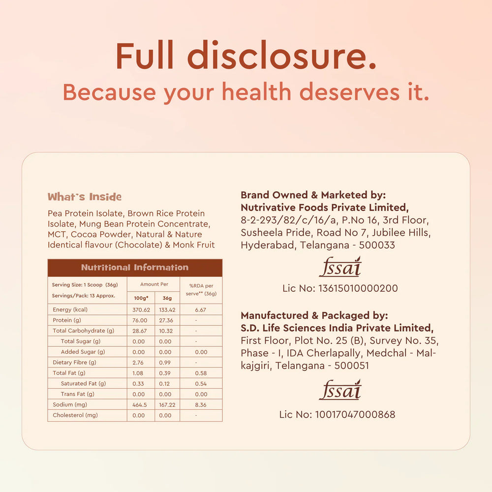 - Pea Protein Isolate, Brown Rice Protein Isolate, Mung Bean Protein Concentrate, MCT, Cocoa Powder, Natural & Nature Identical Chocolate Flavour, Monk Fruit (Nutraceutical — Not for medicinal use)