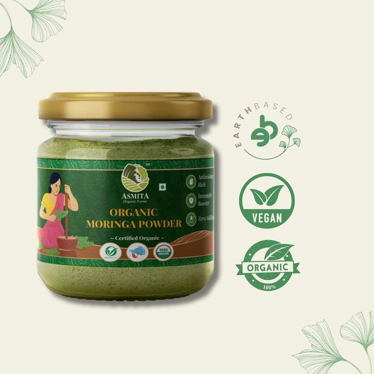 Grown under sustainable farming practices and handpicked from carefully sourced farms in Vidarbha, our organic moringa powder is the powerhouse of essential vitamins and minerals. The collected finest quality moringa leaves are shade-dried sustainably in a premium hygiene environment. It will then be processed carefully to preserve its root flavour and aroma and ground into powder.