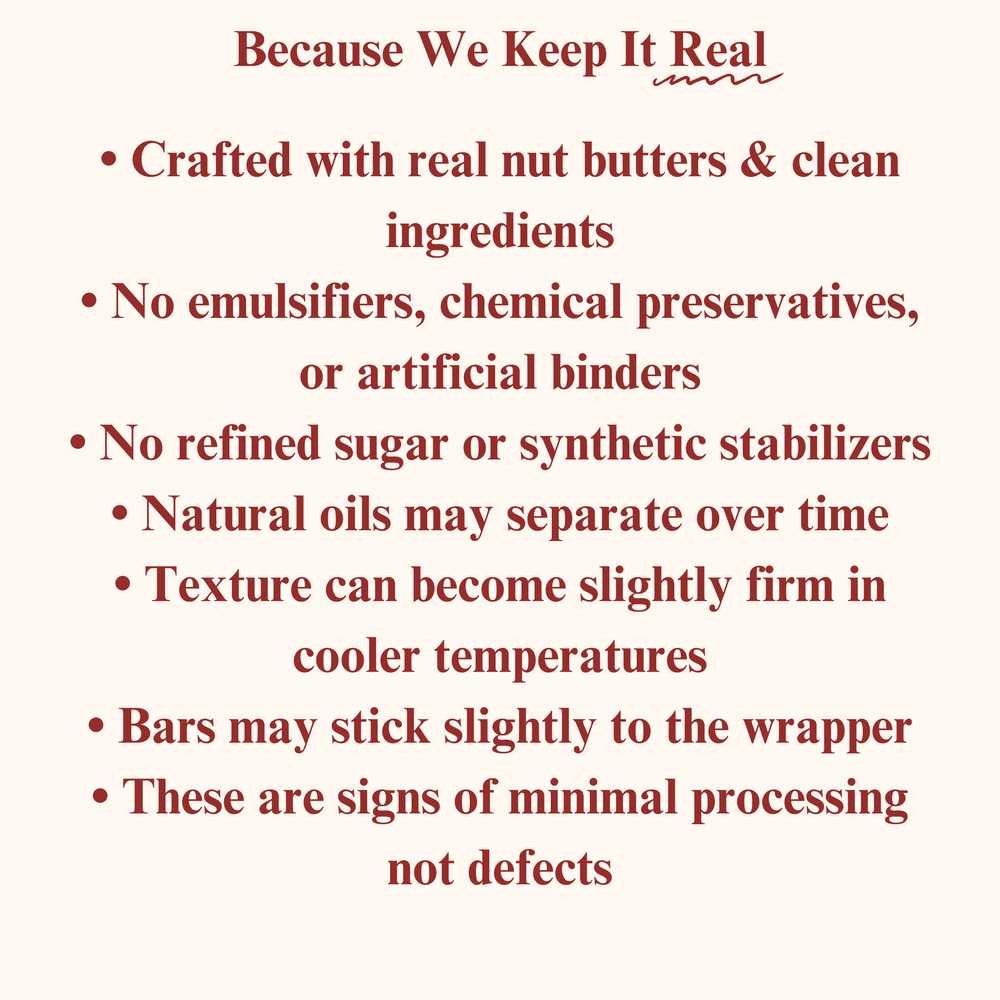 Note: Our bars are crafted in small batches with no chemical preservatives or stabilizers.