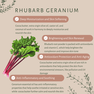 - Anti-Inflammatory and Soothing: Geranium essential oil has anti-inflammatory properties that help soothe irritated or sensitive skin, while the natural healing properties of cocoa butter further calm and nourish the skin. This combination supports skin repair and reduces redness or irritation.