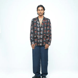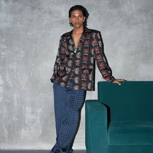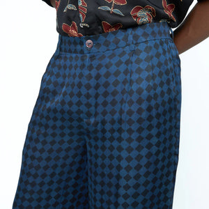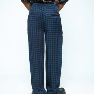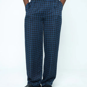 - Description: Full-length trousers featuring the Shadow Checks print. Designed with double pleats at the waist and a tapered leg, they strike the perfect balance between structure and ease — a refined staple for luxe ocassions.